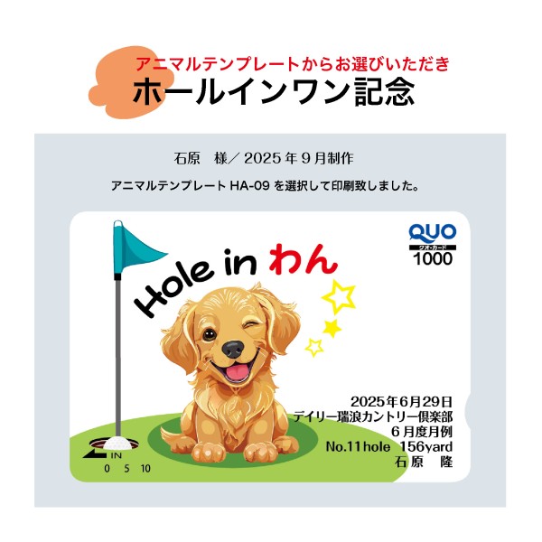 弊社社長が6月の倶楽部競技の際に人生初のホールインワンを達成致しました。QUOカードを作成するにあたり写真かテンプレートかと迷いましたが、『ワン』に因んでアニマルテンプレートからわんちゃんを選びました。差し上げた女性陣には『かわいい』と好評でした。