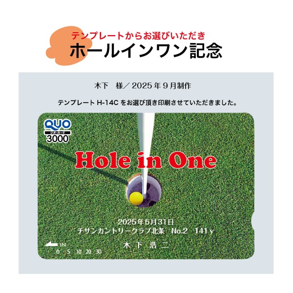 トップページ > お知らせ一覧 > QUOカード制作事例/【テンプレートH-14c】ホールインワン達成記念⛳️ QUOカード制作事例/【テンプレートH-14c】ホールインワン達成記念⛳️ 2025/09/30(火) 木下 様 ホールインワン達成おめでとうございます。この度は、QUO太郎をご利用頂きましてありがとうございました。 <<戻る - Powered by PHP工房 -