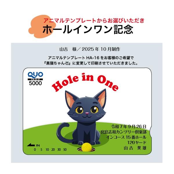 トップページ > お知らせ一覧 > QUOカード制作事例/【アレンジ😍アニマルテンプレートHA-16】ホールインワン達成記念⛳️ QUOカード制作事例/【アレンジ😍アニマルテンプレートHA-16】ホールインワン達成記念⛳️ 2025/10/21(火) 山吉 様 ホールインワン達成おめでとうございます。今回、アニマルテンプレートHA-16を、お客様のご希望で『黒猫ちゃん』に変更して作成させていただきました。この度は、QUO太郎をご利用頂きましてありがとうございました。 <<戻る - Powered by PHP工房 -