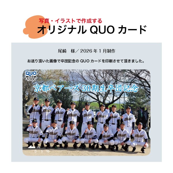 トップページ > お知らせ一覧 > QUOカード制作事例/【お気に入りのお写真でオリジナルQUOカード】㊗️ QUOカード制作事例/【お気に入りのお写真でオリジナルQUOカード】㊗️ 2026/01/21(水) 尾崎 様この度はQUO太郎をご利用頂きまして有難うございました。京都ベアーズ30期生様、ご卒団おめでとうございます㊗️ <<戻る - Powered by PHP工房 -