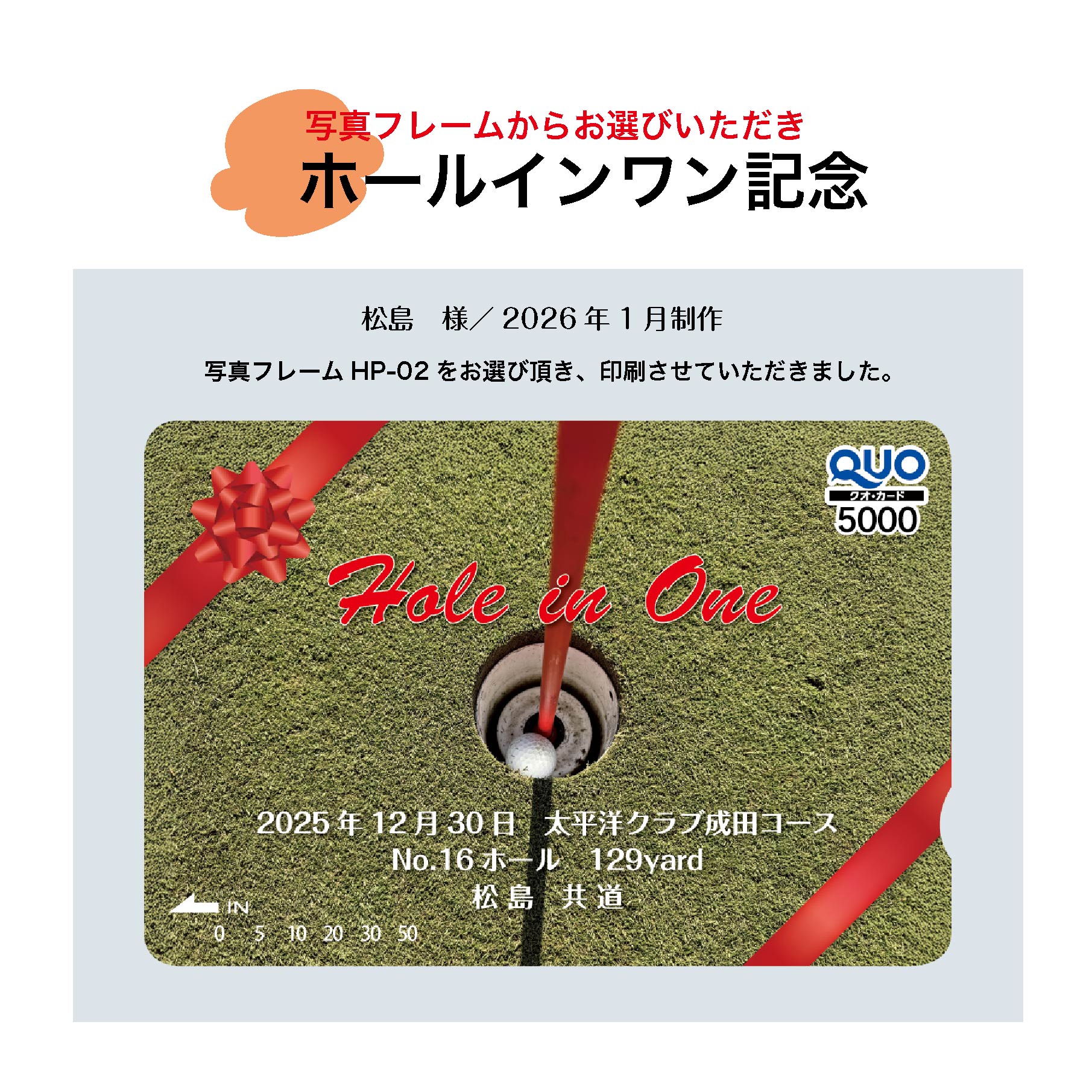 QUOカード制作事例/【写真フレームHP-02】ホールインワン達成記念⛳️